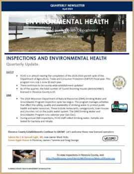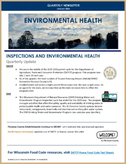 On this page:Application FormsCodes & RegulationsMore Information for Florence CountyWell InspectionsEnvironmental Health Quarterly NewslettersThe Food Safety and Recreational Licensing staff of Florence County Health Department works to ensure a wholesome and secure food supply. The division enforces Florence County’s food safety and labeling laws. The division inspects food establishments statewide including food processors, dairy farms, dairy plants, meat processors, retail food establishments and caterers, and vending machine operators.The Food Safety and Recreational Licensing staff are also responsible for managing programs that enforce applicable state administrative codes for the inspection and licensure of hotels, public swimming pools including water park attractions, campgrounds, tattoo and body piercing establishments.The Florence County Health Department (FCHD) protects the community’s health by ensuring that restaurants, hotels, bed and breakfast establishments, public swimming pools, water attractions, campgrounds, and tattoo and body piercing establishments are in compliance the respective laws. The communities served include Tipler, Long Lake, Fern, Fence, Aurora, Commonwealth, Spread Eagle, and Florence.All establishment inspections are conducted by Environmental Health Specialists (EHS), whom are nationally Registered Environmental Health Sanitarians. These professionals work with establishment owners and managers each day to keep the environment and your food and drinks safe from harmful bacteria, viruses, physical hazards and chemical contaminates.Interested in seeing a food establishments most recent inspection? Visit HealthSpace.